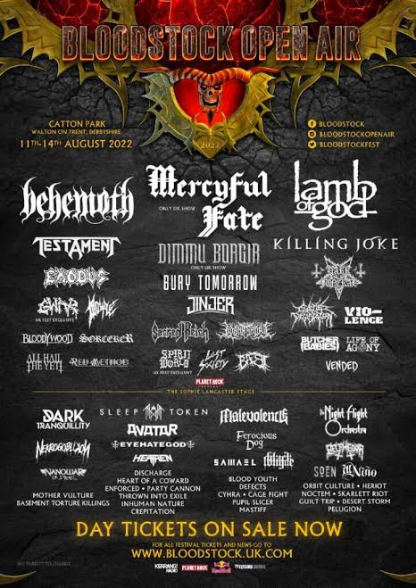 Bloodstock Open Air 2022 terá como ‘headliners’ as bandas Behemoth, Lamb Of God e Mercyful Fate. Além disso, o festival contará com os shows do Killing Joke, Dimmu Borgir, Testament, Exodus, Avatar, All Hail The Yeti, Venom Inc, GWAR, Bury Tomorrow, Sacred Reich, Life Of Agony, Spiritworld, Belphegor, Butcher Babies, Vio-lence, Bloodywood, Jinjer, Lorna Shore, Doyle, Lost Society, Sleep Token, Dark Funeral, Eyehategod, Discharge, The Night Flight Orchestra, Enforced, Party Cannon, Soen, Heriot, Blood Youth, Black Tongue, Heart Of A Coward, Ferocious Dog, Heathen, Nekrogoblikon, Cattle Decapitation, Orbit Culture, Samael, Cyhra, Noctem, Nanowar Of Steel, Thrown Into Exile, Pupil Slicer, Cage Fight, Vended, Ill Nino, Skarlett Riot, Desert Storm, Sorcerer, Red Method, Baest, Mother Vulture, Basement Torture Killings, Crepitation, Inhuman Nature, Mastiff, Pelugion, entre outros.